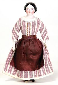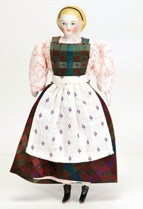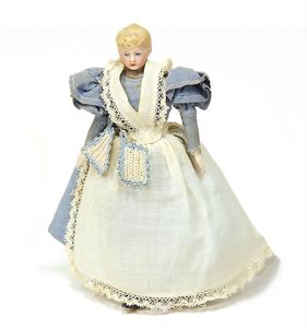 Puppenstubenpuppe, Haushälterin, 16,5 cm, Biskuitbrustblattkopf, fein ausmodellierte Haare, gemalte Augen, Stoffkörper, Biskuitarme- u. Beine, ausmodellierte Schuhe, außergewöhnliche Kleidung