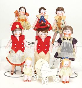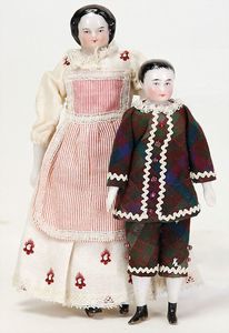 2 Puppen, 1 Hausdame, glasiertes Porzellan, schwarze ausmodellierte Haare, schwarze gemalte Augen, Brustblattkopf, Porzellan-Unterarme sowie –Unterschenkel, ausmodellierte Schuhe u. Strümpfe, 14 cm, dazu kl. Junge, glasiertes Porzellan, blaue gemalte Augen, Porzellan-Unterarme u. –Unterschenkel, Stoffkörper, ausmodellierte Schuhe u. Strümpfe, 11 cm, schönes Konv.