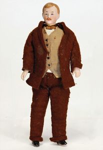 Biskuitporzellan-Puppenstubenpuppe, Brustblattkopf, braune gemalte Haare, blaue Augen, gemalter Schnurrbart, Biskuit-Unterarme u. –Beine, ausmodellierte Schuhe u. Strümpfe, Stoffkörper, 15 cm, brauner Filzanzug