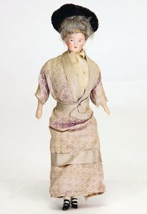 Puppenstubenpuppe, Dame, Biskuitporzellan-Brustblattkopf, gemalte blaue Augen, geschl. Mund, Biskuit-Unterarme u. –Unterschenkel, ausmodellierte Schuhe u. Strümpfe, wohl alte Kleidung, 18 cm, Kleid auf Rücken verschlissen, Hut