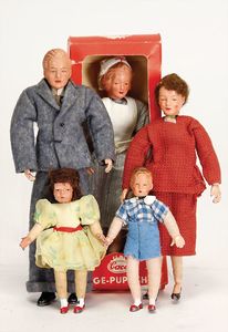 50er Jahre Biege-Puppen, Metall-Hände u. -Füße, Masse-Köpfe, 1 Dame, 13 cm, 1 Herr, 2 Kinder, 1 Hausdame, im Orig.-Kart., 14 cm