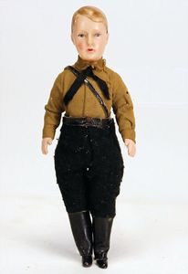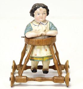 außergew. Puppe im Gehfrei, bewegl. Beine, ausmodellierte schwarze Haare, blaue gemalte Augen, verschränkte Arme, fein ausmodelliert, bemaltes Kleid, sehr schöner Orig.-Zust., 7,5 cm, schönes Dekorationsstück