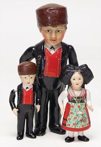 3 Celluloid-Puppen, Frankreich, 1 Pärchen, Mädchen u. Junge in Tracht, 9 cm, 1 Junge in Tracht, gem. France 175, 15 cm, schönes Konv.