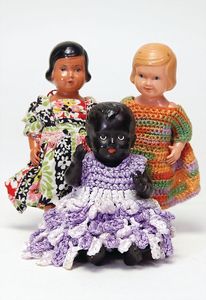 3 Celluloid-Püppchen, 1 x dunkles Storch Mädchen, gem. 14 ½, 14 cm, 1 Storch Mädchen, hell, 14 cm, 1 schwarzes Minerva Baby, gem. 14 ½, 14 cm