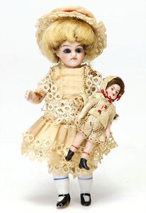 Puppenstubenpuppe, Biskuitporzellan-Brustblattkopf, blonde ausmodellierte Haare, mit Haarreif, blaue gemalte Augen, geschl. Mund, Biskuit-Unterarme u. –Unterschenkel, ausmodellierte Schuhe u. Strümpfe, Stoffkörper, 13 cm