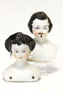 2 Biedermeier-Köpfe, glasiertes Porzellan, Brustblattkopf, 1 x Mann, blaue gemalte Augen, ausmodellierter Schnurrbart, Brustblatt 4 cm breit, H: 5 cm, 1 Dame, durchst. Ohren, blaue gemalte Augen, schwarze Hochsteckfrisur, 5 cm hoch, 4,5 cm breit, schönes Konv.