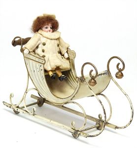 Schlitten, Blech handlackiert, filigran gearbeitet, 20 cm lang, 12 cm hoch, guter Zust., 1 Ganzbiskuit-Püppchen, Mädchen, ausmodellierte Schuhe u. Strümpfe, bewegl. Arme u. Beine