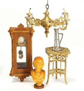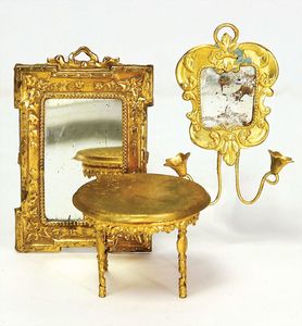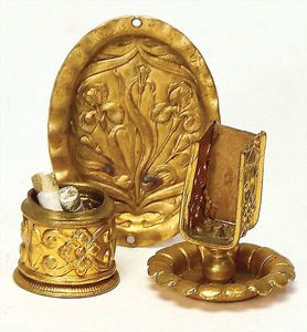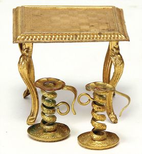 Ausschmückungsteile, Messing/Blech vergoldet, für herrschaftl. Puppenstube, 2 Kerzenhalter, 3 cm, 1 Tisch mit Schachbrettmuster, 5,5 cm hoch, 5,5 cm breit, guter Zust.