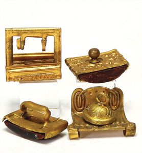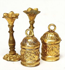 Konv. Ausschmückungsteile, Messing/Blech vergoldet, für herrschaftl. Puppenstube, 2 Kerzenleuchter, H: 3 cm, 2 Dosen mit Deckel, 2,2 cm