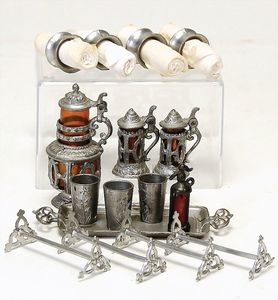 Konv. Ausschmückungsteile für herrschaftl. Puppenstube (Wohnzimmer), 1 x Zinn Serviettenringe, Durchm. 1,5 cm, dazu passende Krüge, 1 Konv. mit Zinn-Krügen, 3 cm hoch, dazu Tablett