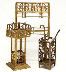 Konv. Messing/Blech vergoldete Ausschmückungsteile f. herrschaftl. Puppenstube, Tablett, 3,5 cm, Aschenbecher, 1 cm hoch, 1 Streichholzanzünder, 2,5 cm, filigrane Arbeit, selten
