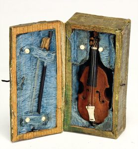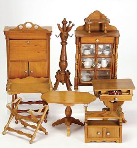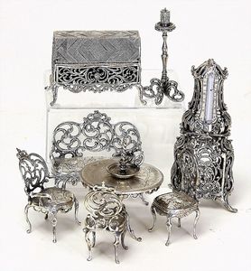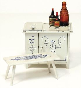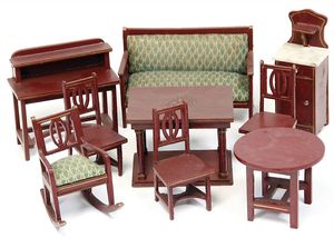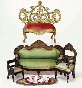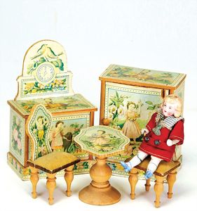 frühe Sitzgruppe mit lithogr. Papier beklebt, Tisch, L: 7 cm, H: 5cm, 2 Stühle, gepolstert, H: 7 cm, 1 Kommode mit Vordertür zum öffnen, H: 10 cm, dazu 1 Schrank, H: 11 cm, schöner Orig.-Zust., 1 Ganzbiskuitpuppe, bewegl. Arme- u. Beine, ausmodellierte Schuhe u. Strümpfe, blonde Haare, 7 cm, ausgefallen
