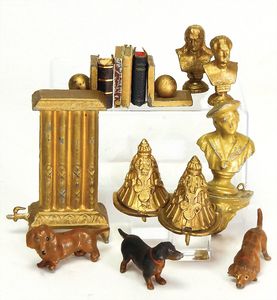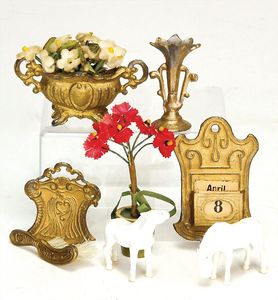 Ausschmückungsteile für Puppenstube, 2 Porzellan-Pferde, 1 x Guss, filigrane Blumenschale, 1 Kalender, 1 Bürste, schönes Konv.
