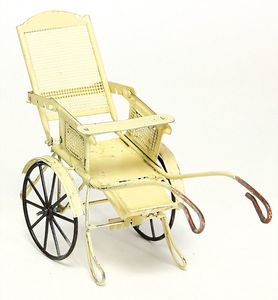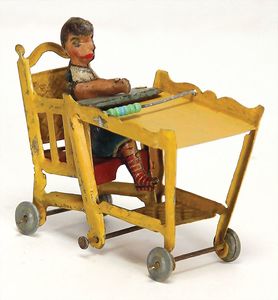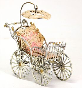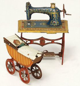 2 Teile Blech, 1 x Nähmaschine, Blech lithogr., 9 cm hoch, 7 cm breit, 1 x Kinderwagen, Blech lithogr., mit Kind, 6 cm hoch, 8,5 cm breit, schönes Konv.