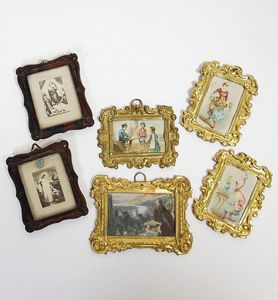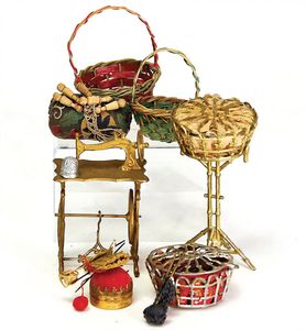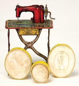 Konv. 3 Gemmen, für Puppenstuben, untersch. Bilderszene, 2 – 4 cm, 1 Weißblech-Nähmaschine, 8 cm hoch
