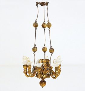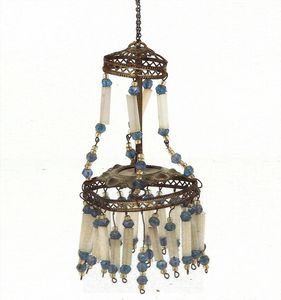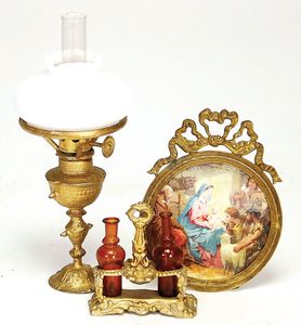 Ausschmückungsteile für herrschaftl. Puppenstube, 1 Petroleumlampe, 13 cm hoch, mit Glas, 1 Wandgemälde, 8 cm hoch, Essig & Öl, 5,5 cm, schönes Konv.