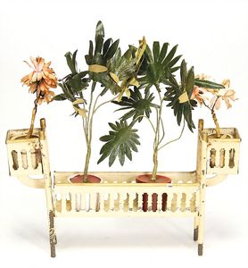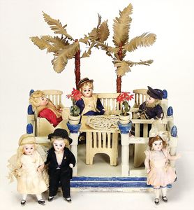 Wintergartengarnitur, mit Palmen, 6 Ganzbiskuitpuppen, Sitzgruppe, Zaunteil, 20x17 cm, schöne Dekoration zu einem Puppenhaus