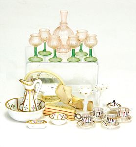 Konv. Glas- u. Porzellanservice, 1 x Weinkaraffe mit 7 Gläsern, zartrosa/mintgrün, ausgefallen, 1 Milchglasservice mit 2 Kerzenständern, Tassen, Unterteller u. Servierschale, 1 Porzellan-Waschset mit Spiegel u. Bürste, fein gearbeitet