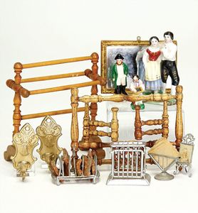 Ausschmückungsteile für herrschaftl. Puppenstube, 2 Wandkerzenhalter, 1 Spiegel, eckig, 6,6 cm, 3 Porzellanfiguren, u.a. Zinn-Küchenutensilien, gem. Germany, 1 Toaster, Brotscheibenhalter, Serviettenhalter