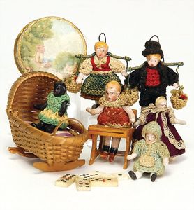 5 Puppenstuben-Miniatur-Ganzbiskuit-Püppchen, dazu 1 Papiermaché-Schachtel, mit lithogr. Papier beklebt, darin 1 Dominospiel, ausgefallen