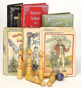 Konv. kl. Kinderbücher, u.a. „Des Kindes Anstandsbuch“, 1 Holz-Kegelspiel mit 6 Kegeln, 1 Holzball