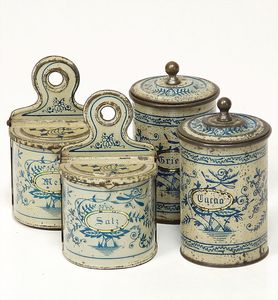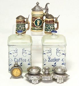 Ausschmückungsteile für Puppenstube, 1 x Tintengefäß, Zinn, 6,5 cm, Krüge, 3 – 5,5 cm, 2 Weißblech-Dosen, lithogr., Zucker u. Kaffee, H: 5 cm