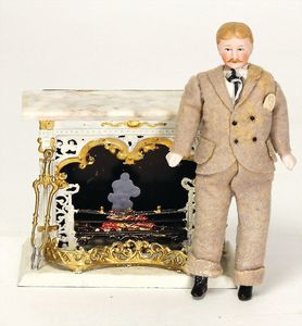 2 Teile, Kamin mit Marmorplatte, für herrschaftl. Puppenstube, filigran gearbeitet, Weißblech, handlackiert, mit Zinn-Feuerstelle, 1 Puppenstuben-Mann, 12 cm, mit Schnurrbart, Stoffkörper, Porzellan –Unterarme und -Unterschenkel