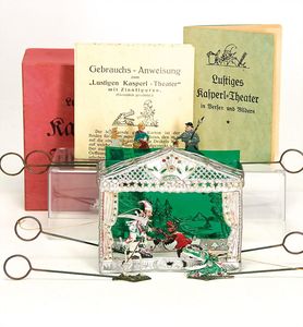 lustiges Kasperletheater, Zinn, seitlich bespielbar, schöne Dekoration in einer gr. Puppenstube oder Puppenhaus, im Orig.-Kart., mit Anleitung