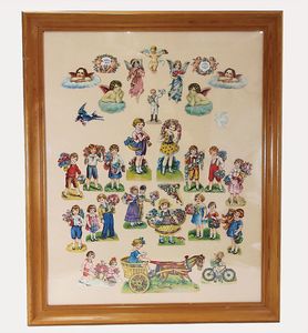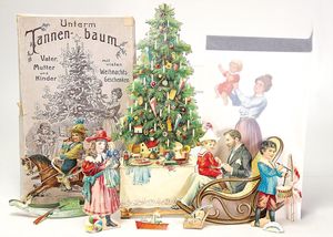 ,,Unterm Tannenbaum", ,,Vater Mutter und Kinder", mit vielen Weihnachtsgeschenken, Aufstellfiguren, im Orig.-Kart., guter Zust., um 1900, ausgefallen