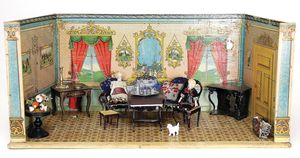 Puppenstubengehäuse, bunt, lithogr., schöner Orig.-Zust., möbliert, Sofa, Rock u. Graner, Bieberacher Blech, 21 cm, einige Boulleteile, kl. Tisch, seitlich aufklappbar, 2 Puppenstubenpuppen, Zinnteile, schöne Gr., rechte Seite hinten kl. Loch in der Rückwand