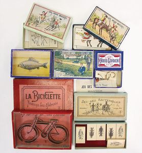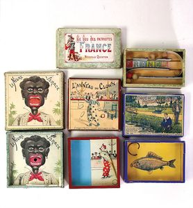 Konv. Geschicklichkeitsspiele, ,,Le Jeu Des Patriotes France", ,,La Carpe De Fontainebleau", ,,L'anneau Du Clown", ,,Le Negre Vorace", guter Zust., alles im Orig.-Kart., um 1900