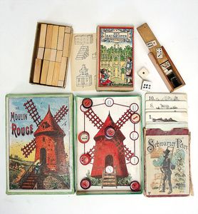 Konv. Spiele, ,,Le Moulin Rouge", ,,Der Baumeister", kl. Holzbaukasten, ,,Schwarzer Peter", kl. Dominospiel, nicht komplett, 2 Porzellanwürfel