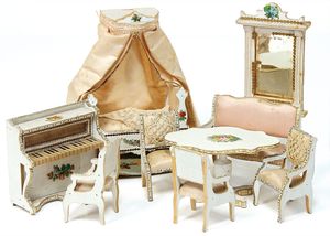 außergewöhnliches Puppenstuben-Möbelprogramm für kl. herrschaftliche Stube oder Reisepuppenstube, Sitzgruppe, Klavier, Bett mit Himmel, H: 15 cm, Tisch u. Spiegel