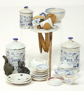 Puppenküchenteile, kl. Porzellanservice, Wandhalter, Porzellan blau/weiß, Klopfer u. Quirl, dazu einige Holzteile, Porzellan Backform, Teller, 2 Dosen mit Knauf, Blech, handlackiert, 7 cm, 1 kl. Dose, Blech, handlackiert, Deckel mit Knauf, 4 cm