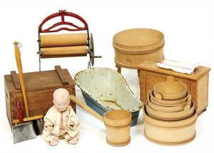Ausschmückungsteile für Waschstube, 7 Holzkrüge, Durch. 5-11 cm, Wäschemangel, Blechbadewanne, Kiste mit Wäscheklammern, 1 Ganzbiskuitbaby, 13,5 cm