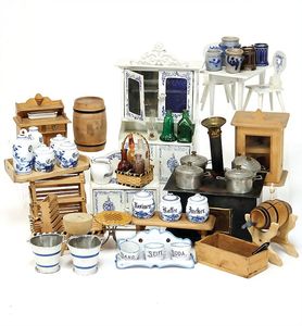 Puppenstubenküchen-Einrichtung, Bing, Blechmöbel, Schrank, H: 23 cm, schöne Orig.-Bemalung, Waschkommode, Stühle, kl. Puppenküchenherd mit Löwentatzenfüßen, reichhaltiges Zubehör, Weinfass, emaillierte Teile, Holzteile, Glasteile, schönes Konv. für eine Küche