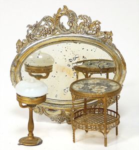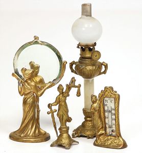 4 Teile Puppenstubenzubehör, außergewöhnliche Stehlampe, 12 cm, Jugendstil Spiegel, Thermometer, Justitia mit Waage u. Schwert