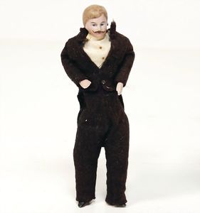 Puppenstubenpuppe Mann, mit Schnurrbart, 18 cm, Biskuitbrustblattkopf, fein ausmodellierte Haare, gemalte Augen, Stoffkörper, Biskuitarme- u. Beine, mit ausmodellierten Schuhen, Filzkleidung