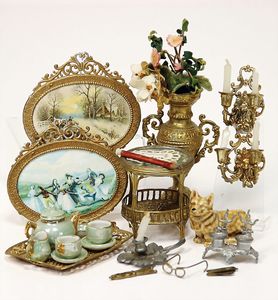 2 Puppenstuben Bilder, mit Zinnrahmen, 7,5 cm, 2 Zinn Wandleuchter, 4 cm, Beistelltisch, Vase, Nussknacker, Brille, Taschenmesser, Schreibzeug, kl. Porzellanservice, schönes Konv., 1 Porzellanhund