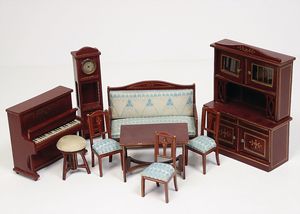Wohnzimmer, Möbelprogramm, Schrank, H: 20 cm, Sofa, Klavier, Tisch, 3 Stühle, Klavierhocker, sehr schöner Orig.-Zust.