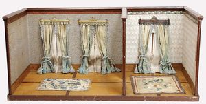 Biberacher Blech, 2-tlg. Puppenstube, B: 86,5 cm, H: 39 cm, T: 41,5 cm, 3 Fenster, mit Blecheinfassung, Orig.-Vorhangblenden, Blech, alte Vorhänge, Orig.-Tapete, Orig.-Bodenbemalung