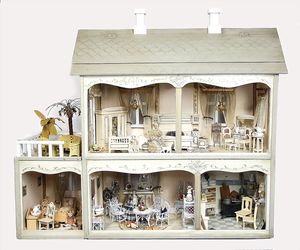 Puppenstubenhaus, B: 190 cm, H: 100 cm, T: 35,5 cm, seitlich Anbau mit Terrasse, 5 Zimmer, mit reichh. Zubehör, Holz- und Draht-Mobiliar, 2 Puppenstubenpuppen