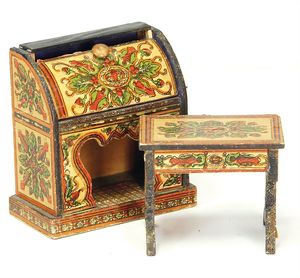 Konv. Ausschmückungsteile für Puppenstube, 1x Sekretär, Holz, mit bunt lithogr. Papier beklebt, H: 7 cm, B: 6,5 cm, 1 Beistelltisch, B: 5,5 cm, schöner Orig.-Zust.