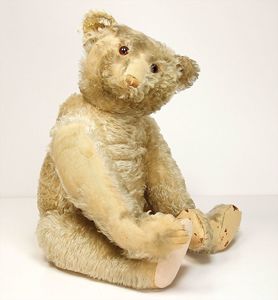 Steiffbär, ca 1930, 70 cm, außergew. Größe, weiß, helle Nasenbestickung, eine Filztatze übernäht, Filz teilw. aufgerissen, einige Stellen Mohair Verlust, mit Knopf