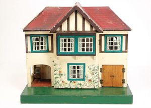 englisches Puppenhaus, 30er Jahre, 48 cm breit, 42 cm hoch, 27 cm tief, vorne zum Öffnen, mit Garage, Fenster Blech, bespielter Orig.-Zust., ohne Zubehör