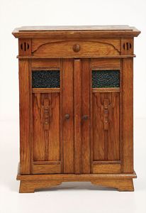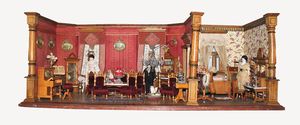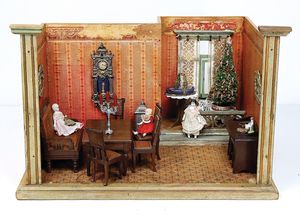 2-tlg. Puppenstube, ca. 1890, 1,05 m breit, 39 cm hoch, alte Tapete an Wand u. Boden, hinten 3 Fenster, 2-flüglige Durchgangstür, 1 Raum unten vertäfelt, hochwertig möbliert, mit Zubehör
