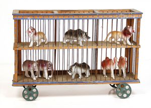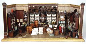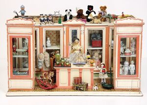 Modeladen, eingerichtet als Spielwarengeschäft, 52 cm breit, 31 cm hoch, alte Bemalung, alte Bodentapete, seitl. Schaufenster, hinten Vitrinen, reichh. Zubehör