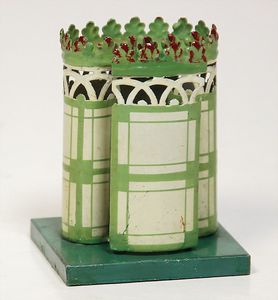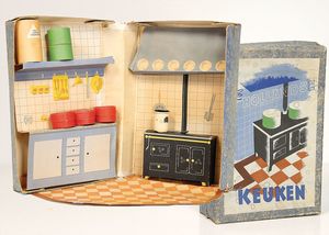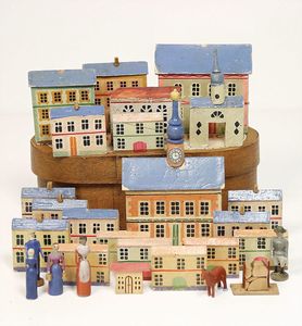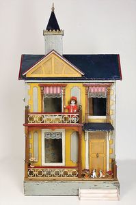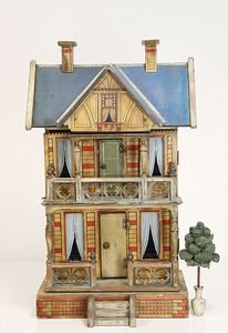 kl. Haus, 50 cm hoch, bebauter Eingangsbereich, oben Balkon, mit lithogr. Papier beklebt, Tapete innen u. außen orig., teilw. altersbed. verschmutzt u. verschlissen, Bemalung orig. jedoch abgegriffen, schöne Gr., mit Treppe, ca. 1890