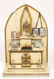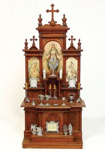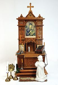 prächtiger Hausaltar, Gründerzeit, Eiche, reichh. Zubehör, 33 cm breit, ca. 1890, schöne Puppendekoration