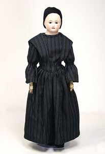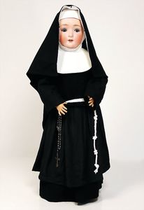 1909, Biskuitporzellan-Kurbellkopfpuppe, blaue Schlafaugen, off. Mund, oben Zähne, Gliederkörper, auf der Stirn restauriert, angezogen als Nonne, 62 cm